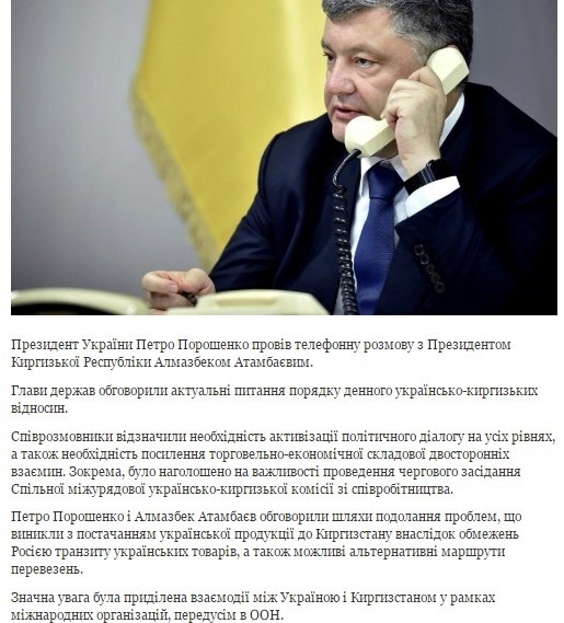 Как сообщал   Корреспондент.net, в среду, 2 октября, на официальном сайте президента Украины появилось сообщение о состоявшемся телефонном разговоре с президентом Атамбаевым. В сообщении указывалось, что стороны «обсудили актуальные вопросы повестки дня украино-киргизских отношений».