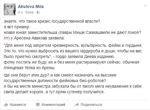 Также Деева написала, что очень гордится своим начальником. «Я очень горжусь тем, как воспринимают Главу нашего Министерства, горжусь его сильной непоколебимой и мудрой позицией», — сообщила она в одном из постов.
